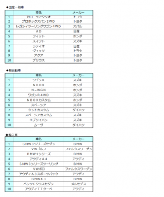 国産一般車は先月15位のカローラアクシオ(トヨタ)が不動の人気を誇るアクア(トヨタ)を追い抜き首位となり躍進を遂げました。先月20位のプロボックスバン2WD(トヨタ)も順位を上げ2位に。軽自動車部門は、ワゴンR(スズキ)が今月も首位となり4か月連続トップです。先月8位のNBOX(ホンダ)は2位にランクアップしました。輸入車部門は今月もBMW3シリーズセダン(BMW )が首位。ともに上位を歩んできたBMW5シリーズセダン(BMW)はまさかのランク外となりVWゴルフ(フォルクスワーゲン)が2位へと躍り出ました。今後の動きからも目が離せません。