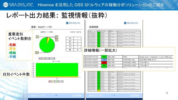 プレゼンテーションでは、Hinemos の新機能である「レポーティングオプション」につきまして、その設定方法やレポートの例などを説明しました。