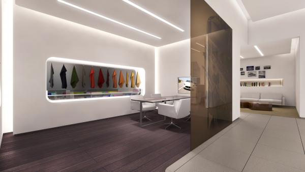 ショールームのデザインは、最新のマセラティCIを全て導入。洗練された白とブルーを基調に、ラグジュアリースポーツブランドにふさわしいエレガントな雰囲気を提供。大きなガラス張りのスペースが、明るい開放感とくつろぎを演出します。