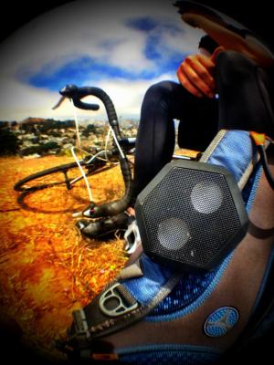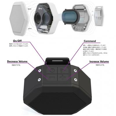 『Boombot REX』は、超軽量のウルトラポータブルスピーカーで、2.1スピーカーシステムです。スマホを取り出して操作しなくても、本体上部のボタンから操作でき、ON/OFF、ヴォリューム調整、再生/一時停止ボタンがあり、再生/一時停止ボタンは2回押すと次曲へ移動、長押しの場合ですとiPhoneのSiriが立ち上がります。