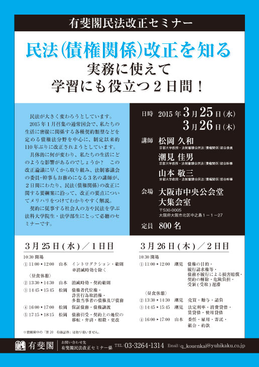 株式会社有斐閣(東京都千代田区,代表取締役社長:江草貞治)は,3月25日(水)・26日(木)の2日間,有斐閣民法改正セミナー「民法(債権関係) 改正を知る 実務に使えて学習にも役立つ2日間!」を大阪市中央公会堂の大集会室にて開催します。