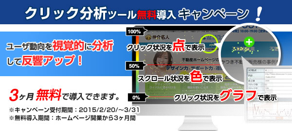 【仲介名人】を新規契約される方を対象にホームページ内のユーザ動向が視覚的に把握できる“クリック分析ツール”を無料で提供します。当ツールはユーザ動向を計測しながらホームページ改善ができるので、人気コンテンツが明確になり、より反響をとりやすいホームページ改善をスピーディに行うことができます。