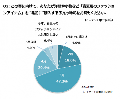 20代以上の女性に今年の春夏ファッションアイテムを最初に購入する時期について答えてもらったところ、全体の半数近い47.2%が「3月」と回答した。次いで「4月」(20.4%)、「2月」(18.0%)。全体の約7割(69.2%)が1~3月に最初の春夏用ファッションアイテムを購入すると答えた。