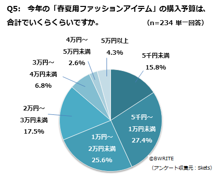今年、春夏用ファッションアイテムを購入予定の方に、購入予算を答えてもらった。最も多かったのは「5千円~1万円未満」で27.4%、次いで「1万円~2万円未満」が25.6%。合計すると、1万円未満が全体の43.2%、2万円未満が68.8%となっている。