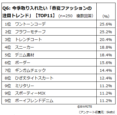 その他、「フラワーモチーフ(花柄)」「トレンチコート」「スニーカー」「デニム素材」「ボーダー」「ギンガムチェック」など、注目トレンドの上位には、定番の春夏らしいアイテムや柄が挙がった。
