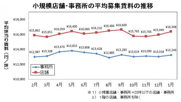 小規模店舗(20坪以下)の1月度平均募集賃料は、前月から2.5%上昇し、4ヶ月ぶりに、坪当たり1.6万円/坪を上回る水準に達しました。