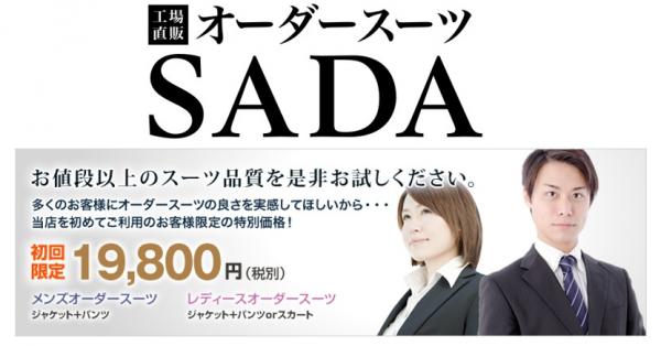 (株)佐田は生地企画から縫製・販売まで自社内で行うことが出来るため、中間流通コストを極小化することが可能です。その強みを活かし、直販店の「工場直販オーダースーツSADA」では初回のお客様には19.800円(税別)のお試し価格でオーダースーツをご提供しています。