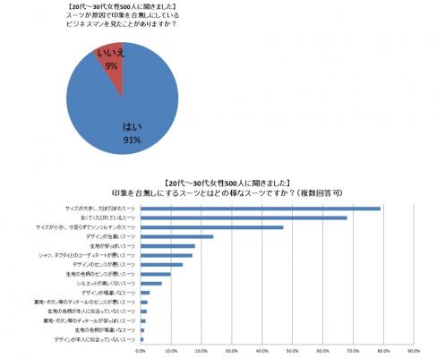 佐田が20代30代女性500人にとったアンケート結果では、91%の女性が「スーツが原因で印象を台無しにしている男性を見ますか?」との質問に、「YES」と答えました。どんなスーツが印象を台無しにするかとの問いに対しては、「サイズが大きく、ダボダボのスーツ」が、「古くてくたびれたスーツ」を上回り、ダントツの1位にランクインしました。もっと上位に来ると思われた、「デザインが古臭い」「生地が安っぽい」は高いシェアを占めておりません。このアンケート結果から考えますと、「斬新なデザイン」「高級な生地」の「サイズが大きく、ダボダボのスーツ」を着ている方は、ピエロということになってしまいます。