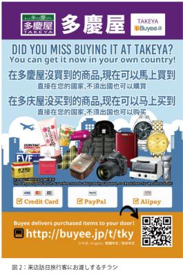 ・転送コムが展開する越境ECの仕組みを使えば、提携企業は無料かつ手間なく越境ECサイトが構築できる(図1)。多慶屋側(提携店舗側)は訪日旅行客向けに案内のチラシ(図2)を配布するだけ。