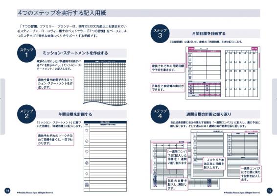家族のミッションをつくり目指すべき方向を定めたうえで、年間目標~月間計画~週間計画~日々の計画と管理と、将来から1日まで一貫した計画と行動を行うことができます。