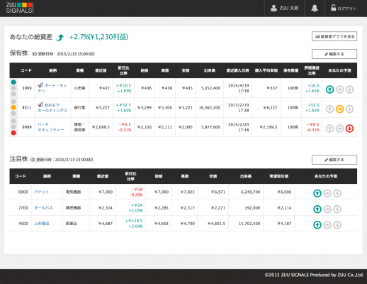 そこで『ZUU Signals』は、扱う証券の領域を身近であることから理解しやすい『日本株』に限定。圧倒的にシンプルに、誰もがわかる赤・青・黄の信号で保有株の状態を分かりやすくお知らせします。