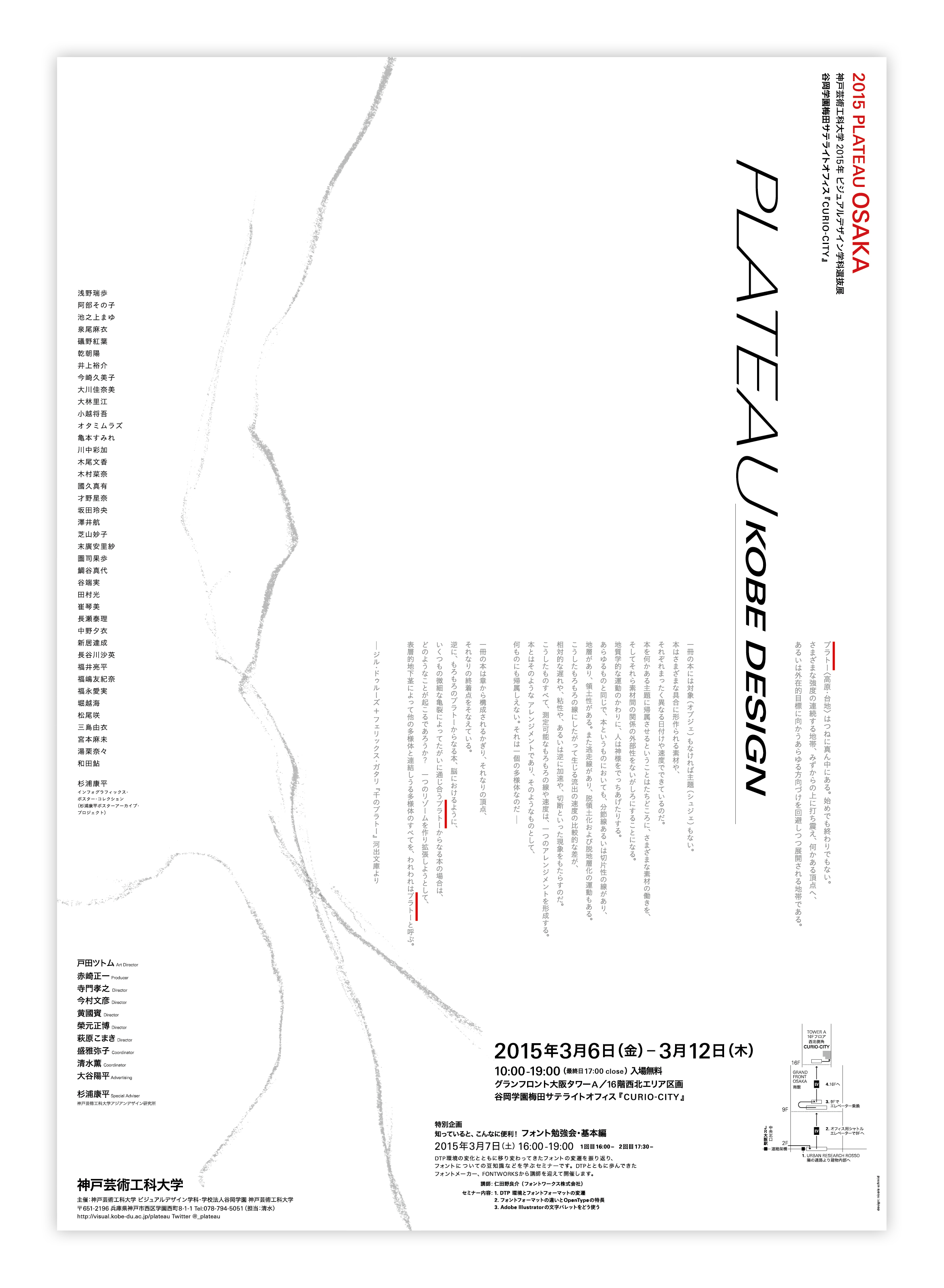 学校法人 谷岡学園 神戸芸術工科大学(神戸市西区、学長・齊木崇人)では、グランフロント大阪タワーA・16階に開設されました学校法人 谷岡学園 梅田サテライトオフィス「CURIO-CITY(キュリオ-シティ)」(平成26年6月開設)にて、2015年3月6日(金)~3月12日(木)10時~19時(最終日17時まで)に本学のビジュアルデザイン学科 選抜展『2015 PLATEAU OSAKA』ならびに、3月7日(土)16時~、17時30分~、特別企画『知っていると、こんなに便利!フォント勉強会・基本』と題したセミナーを開催いたします。