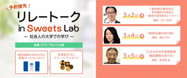 大手前大学通信教育部は、グランフロント大阪のスイーツ・ラボにて、スイーツ付無料セミナー「リレートークin Sweets Lab」の第2回を3月4日(水)に開催いたします。このリレートークは、本学の多彩な教員陣が「社会人の大学での学び」をテーマに全3回でお送りするアカデミックトークイベントです。
