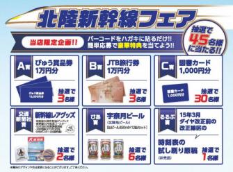 東京駅 - 富山駅間が2時間8分、東京駅 - 金沢駅間が2時間28分でつながり、経済活性化に大きく寄与すると期待されている北陸新幹線。本企画はその開業を記念し、書店を通して北信越地方を盛り上げようと立ち上げた、日販オリジナル企画です。キャンペーン期間中に対象の雑誌・ムック2誌を購入し、書店店頭に設置した専用はがきで応募すると、抽選で豪華賞品が当たります。賞品の中には、今春ダイヤ改正される時刻表の改正前の試し刷り原稿といった、鉄道ファンにはたまらないレアなグッズもあります。