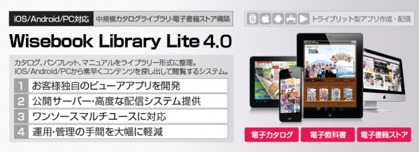 「Wisebook Library Lite 4」とは、お客様にとって独自ブランドの電子カタログ/カタログライブラリを短時間・低コストで開発しご利用いただけるサービスです。