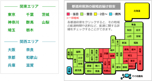 さらにその他の西日本地域への配送スピードも短縮され、九州への最短お届けが翌々日から翌日に、中国・四国への最短お届けは翌日午後から翌日午前になります。(一部対象外の地域もございます)
