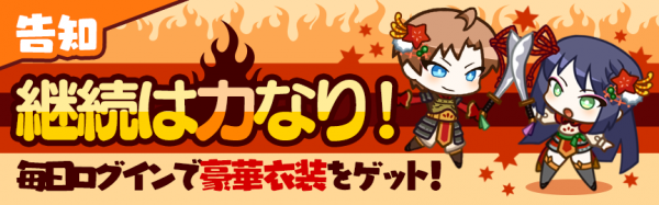 ・累積ログイン日数24回:『豪傑の鎧【女性専用】』または『豪傑の鎧【男性専用】』×1個