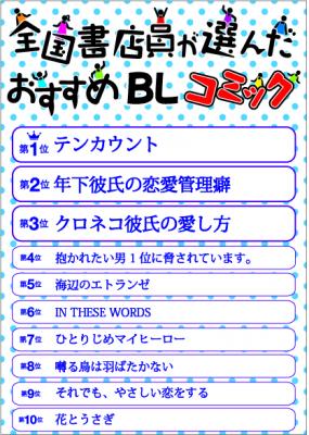 記念すべき10回目を迎えた今回は、スピンオフ企画として、近年20代~40代の女性を中心に注目されている「BL(ボーイズラブ)」コミックに特化した企画「全国書店員が選んだおすすめBLコミック2015」を開催しました。「おもしろい」と思うBLコミックをアンケートで募集し、400店舗・合計470名の書店員から投票を得た結果、第1位に輝いたのは『テンカウント』(宝井理人/新書館)でした。続く第2位には『年下彼氏の恋愛管理癖』(桜日梯子/竹書房)、第3位には『クロネコ彼氏の愛し方』(左京亜也/新書館)がランクインしました。