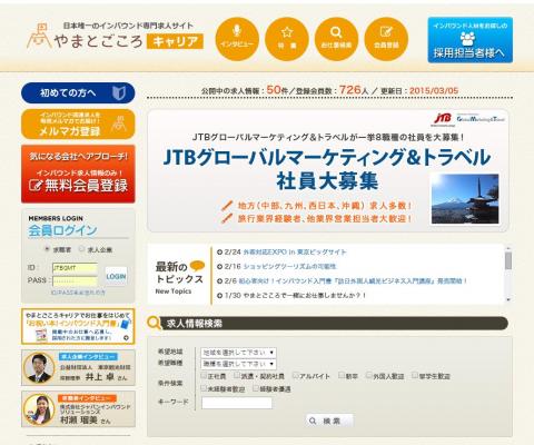 日本最大のインバウンド(訪日外国人観光)業界向けB to B ポータルサイト「やまとごころ.jp」を運営する、株式会社やまとごころ(本社:東京都新宿区 代表:村山慶輔)は、2014年7月日本初のインバウンド専門求人サイト「やまとごころキャリア」を公開し、2015年2月末現在で求職者会員数は700名を超えました。「成果報酬型」と「広告掲載料型」の選べる2つの料金プランを設定し、企業の求人情報掲載数も増やしております。