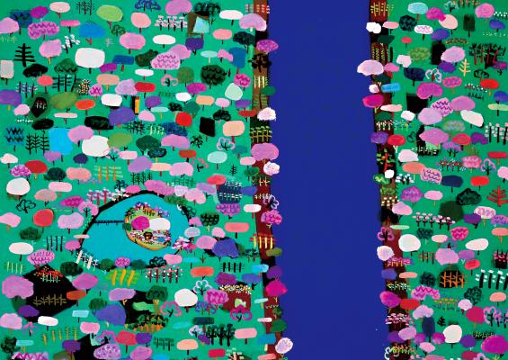 塗りののびやかさ、点描画に近い筆の置き、折れそうに細い線の密集。油絵具によって具象も抽象も自由にミックスされた大谷太郎氏の絵画世界は、おとぎ話のグラフィカルなワンシーンのようです。ふんだんな色づかいは暖色と寒色の均衡などにとらわれず、モザイク配置で躍り上がるような色とその印象のぶつかり合いが脳内を揺さぶって、日常生活から遊離する楽園感覚を味わわせます。その一方で、情熱的な密度の描き込みパワーに押されるうち、彼が感じた光景が確かにうっすらと想像され、絵から帰納して私たちの心にすっきり落ち着く。そんな得がたい体験に包まれています。