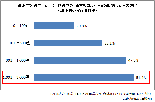 下記グラフは、紙の請求書を発行している経理担当者の中から、「郵送費や資材のコストを課題と感じる」と回答した方を、毎月の請求書発行通数別に示したものです。毎月の請求書発行通数が100通以下の場合は21.1%ですが、発行通数が増えるほどその割合は増え、1001通以上を毎月発行する企業の経理担当者においては、過半数の52.7%を占める結果となりました。これは請求書を郵送で発送する場合、切手代などの郵送費に加え、紙代や印刷代などの固定費が1通毎にかかるため、発行通数が増えるほど負担が大きくなるからと言えます。