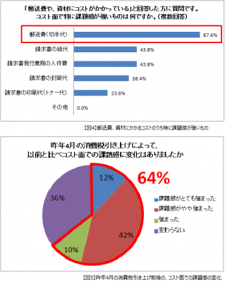 「今後計画される消費税の引き上げにより、郵送費や資材のコスト増が予想されますが、対策はとられていますか」という質問に対して、「対策をとっている」と回答したのは2割に満たず、8割以上の企業では何の対策もとられていないいということがわかりました。2017年には現在の8%から10%へ消費税が引き上げられることが計画されており、さらに年々人件費も高騰しています。現在よりも請求書を郵送するためにかかるコストは増加することがわかっていながら、コスト改善の一歩を踏み出すことができない現場の実情がわかる結果となりました。