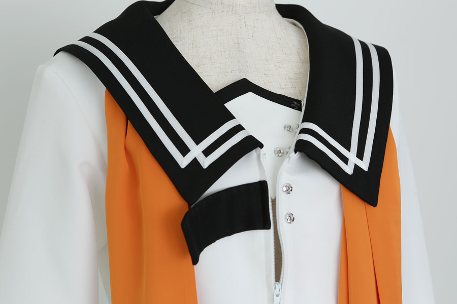 特徴的なセーラーカラーのラインや幅広のスカーフといった作中でも目を引くポイントに加えて、実用的な透け防止の裏地や脱ぎ着しやすい前中心のファスナー開きなどの機能面にも細部までこだわり再現しました!