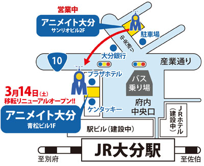 全国に115店舗展開する、アニメ・コミック・キャラクターグッズの専門店「アニメイト」の大分店が2015年3月14日(土)に移転リニューアルオープンを致します。大分の地にアニメイトが2002年にオープンしてから13年目となる本年、JR大分駅から徒歩1分の場所に移転します。より便利に、より広くなって皆様をお待ちしております。
