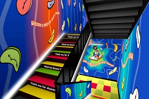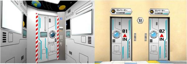 また、店内には、筑波宇宙センターに近い立地からロケットをモチーフとしたエレベーターや、現代から未来をイメージしたタイムマシーンに乗ったドンペンが描かれた屋上駐車場につながる階段があり、同店ならではの地域性をいかした演出となっています。