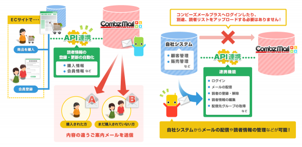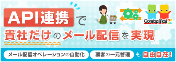 APIシステム連携は、このようなお客様からのご要望にお応えし、実装された機能です。自社システムを使いながら、コンビーズメールプラスでメール配信を。コンビーズメールプラスのAPIシステム連携により、スムーズなメール配信を実現します。