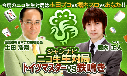 株式会社ウインライトが運営する本格オンライン麻雀アプリ「ジャンナビ麻雀オンライン」は、3月26日に独自のトイツ理論を繰り広げ数々のタイトルを制してきた土田浩翔プロと、神速の鳴きで次世代の麻雀界を担う堀内正人プロとのニコ生生対局を行います。