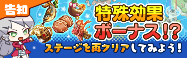 本イベント期間中に一度でもクリアしたことのあるステージを再挑戦しクリアすることで、様々な強化アイテムを消費せずに、30分間だけ同等の強化効果がランダムで付与されます。