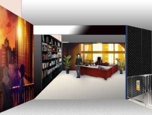 大型タペストリー、等身大パネル、テーブルシート等で店内を作品一色に装飾