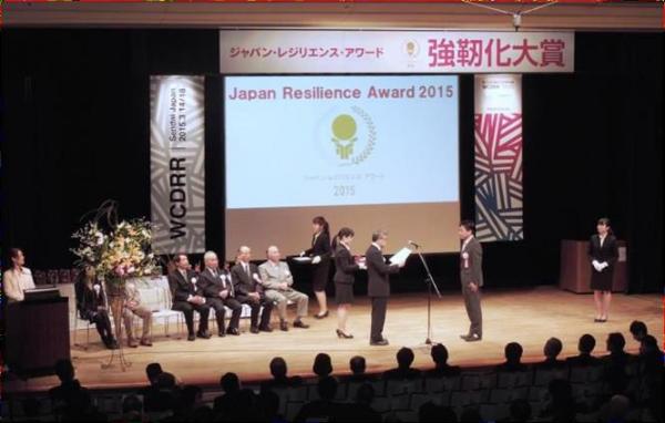 3月14日~18日に、天皇・皇后両陛下、安倍首相夫妻および18か国から賓客を招いて仙台市で開催された「第3回国連防災世界会議」の公式日程の中で行われた「第一回ジャパン・レジリエンスアワード表彰式」には、全国の自治体、事業者、NPO、教育機関などから提案された208件の事業の中から選抜された受賞者が参加しました。