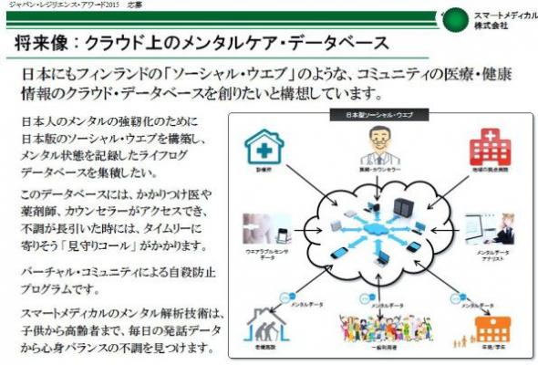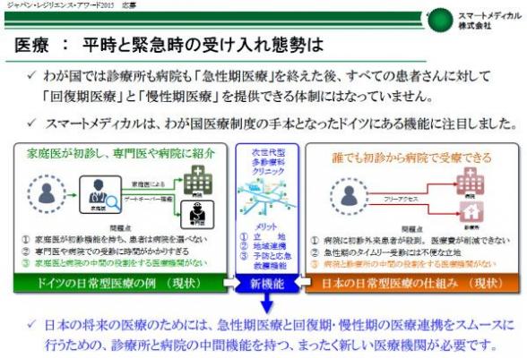 スマートメディカルは、(1) 「日本人のメンタルを強靭化する ~音声感情認識技術を使った自殺予防と認知症対策~ 」 (ICTセルフケア事業部:下地貴明取締役事業本部長)、および(2) 「医療による国家強靭化と地方創生 ~次世代型多診療科ヘルスケアモール開発事業~ 」(PCC事業部:足立信也取締役事業本部長) の2本の事業提案を行い、それぞれ最優秀レジリエンス賞(医療・保健部門1社)、および優良賞(32社のうちの1社)を受賞しました。