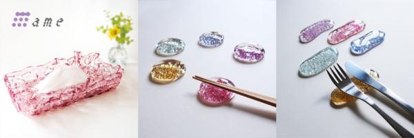 ガラスの透明感と樹脂の軽やかさを併せ持つ箸置き、アンダープレート、ナフキンスタンドなどのテーブルウェアを揃えました。
