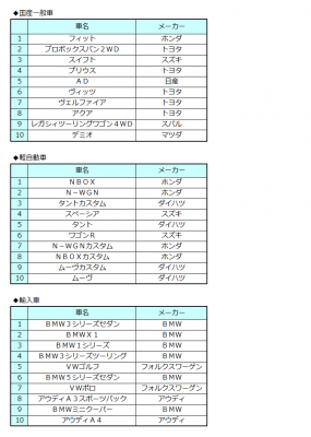 国産一般車はランキング常連のフィット(ホンダ)がついに首位を得ました。プロボックスバン2WD(トヨタ)は先月に引き続き2位で人気は継続中です。軽自動車部門は首位独走だったワゴンR(スズキ)を抜き、NBOX(ホンダ)が首位に躍り出ました。N-WGN(ホンダ)も着実に順位を上げ今回2位と奮闘。輸入車部門はトップ4位までをBMWが独占しました。VWゴルフ(フォルクスワーゲン)はランクダウンはしましたが根強い人気を見せています。今後の動きにも注目です。