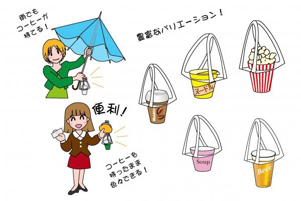 手提げホルダーはコーヒーやビールの紙コップ、プラスチックコップはもちろん、ポップコーンやカップラーメンなどの容器にも対応可能です。