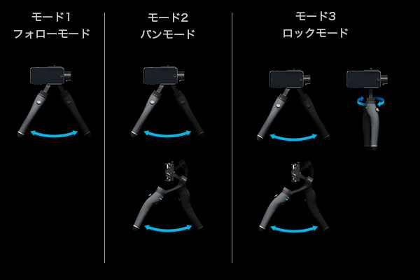 モード2 パンモード:カメラを垂直に固定し(チルトをロック)、なめらかなパンニング操作を実現します。