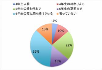 「6年生の夏前までと6年生の夏以降も習い事を続けさせる」が51%と過半数を超えていますが、一方で、36 %の方が、「5年の終わりまでに習い事はやめさせる」との答えです。