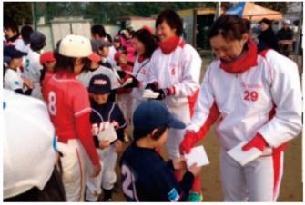 2015年2月6日(土)、地元・京都の小学生女子野球チームを迎えた野球教室にて、子供たちへラブレターを手渡しする「京都フローラ」の選手たち。子供たちからは「一生の宝物です」「私もプロを目指します」という声があがりました。