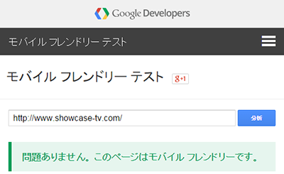 スマートフォン・コンバータを利用しているショーケース・ティービーのWebサイトは、Googleのデベロッパーツールにより、モバイル フレンドリーなサイトであることが確認されております。