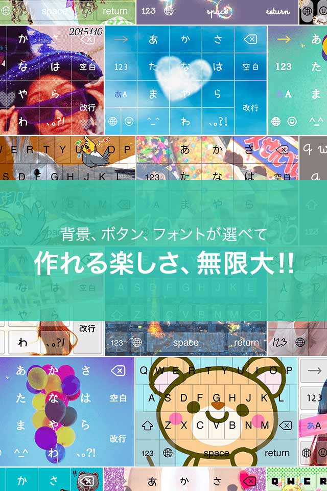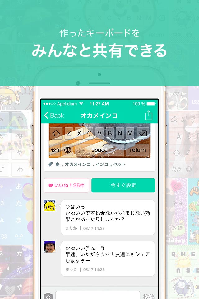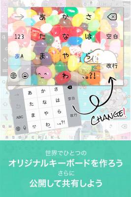 本アプリでは、キーボードの背景、ボタン、フォントを変更でき、作成したキーボードを自分のキーボードに設定できるだけでなく、「ギャラリー」というコミニュティに投稿することが可能です。「ギャラリー」では、他ユーザーが作成したキーボードも設定を行うことができ、TwitterやInstagramでギャラリー上にあるキーボードを共有することもできます。