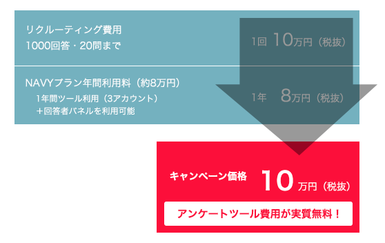 ヤフークラウドソーシング20問まで1000回答:10万円(税抜)、およびクリエイティブサーベイ NAVYプラン(年間8万円)のセットをキャンペーン期間にお申し込みいただくと、18万円のところ、合計10万円(税抜)でご提供いたします。
