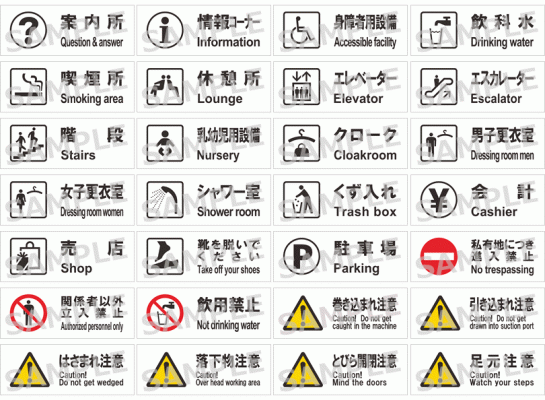 ・「案内所」「喫煙所」「エレベータ」「クローク」などの場所を案内するための表示ステッカーです。