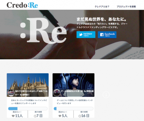 この度、3月24日に株式会社kairoはジャーナルクラウドファンディグサービスCredo:Re(クレドア http://credore.me)α版をリリースしましたのでお知らせいたします。Credo:Reは調査や取材を行って記事を執筆したいユーザーとそれを読みたいユーザーをマッチングさせるサービスです。Credo:Reを使うことで、ライターは簡単に取材や調査に必要な費用を集めることができ、読者は「まだ記事化されていないけれど読みたい記事」を資金的に応援することができます。