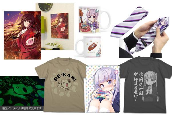 NEW GAME! フルカラーマグカップ(1500円+税)、今日も一日がんばるぞいネクタイ(4,500円+税)、今日も一日がんばるぞい!Tシャツ(2,900円+税)、涼風青葉クリーナークロス(400円+税)