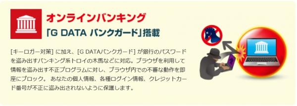 昨今、国内でも問題になっているオンラインバンキングにおけるデータ送信や「Facebook」に代表される SNS などのログイン情報などを、ブラウザーと通信の隙間を狙い情報を盗むマルウェア MITB (Man-In-The-Browser attacks) の活動についても、瞬時に阻止する G DATA [バンクガード] と [キーロガー対策] も装備し、高い安全性を誇っています。