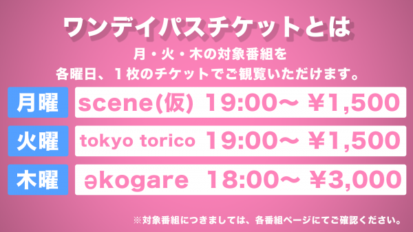 月・火・木曜のイベント内は4月より番組観覧方法も一部変更となり、従来の番組毎のチケット購入ではなく、チケット1枚で対象のすべての番組が観覧できるお得なワンデイパスチケットを発行いたします。