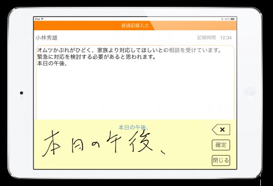 紙に書く感覚でiPadにケア記録を手書き入力します。手書き入力した文字が数字、かな、漢字、記号に自動で活字変換されるため、初めてiPadをお使いになる介護職員の方でも直感的に利用できます。